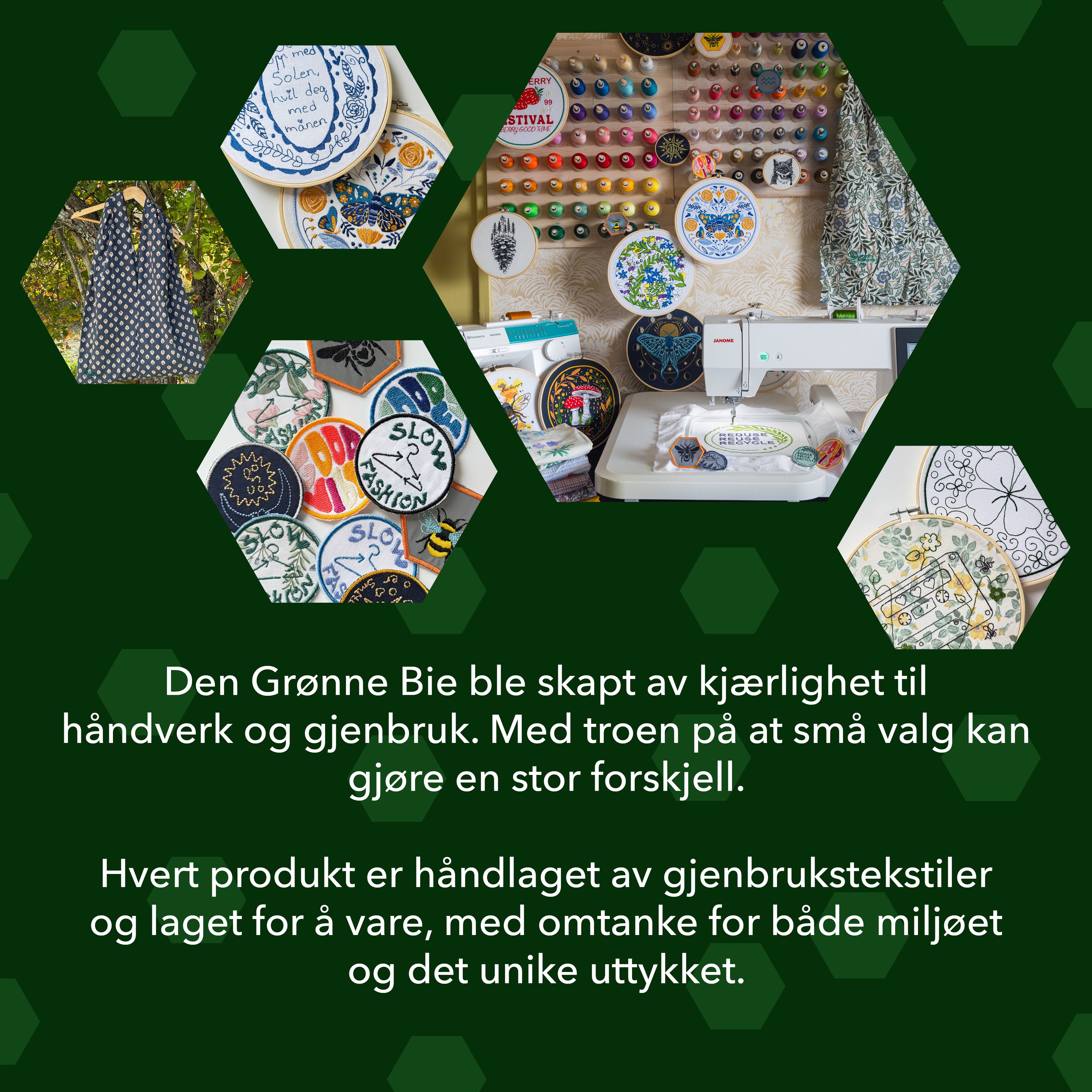 Den grønne bie skaper håndlagde produkter av gjenbrukstekstiler – små, bærekraftige valg som gir nytt liv til materialer og skaper kunst for deg, hjemmet ditt og planeten vår.