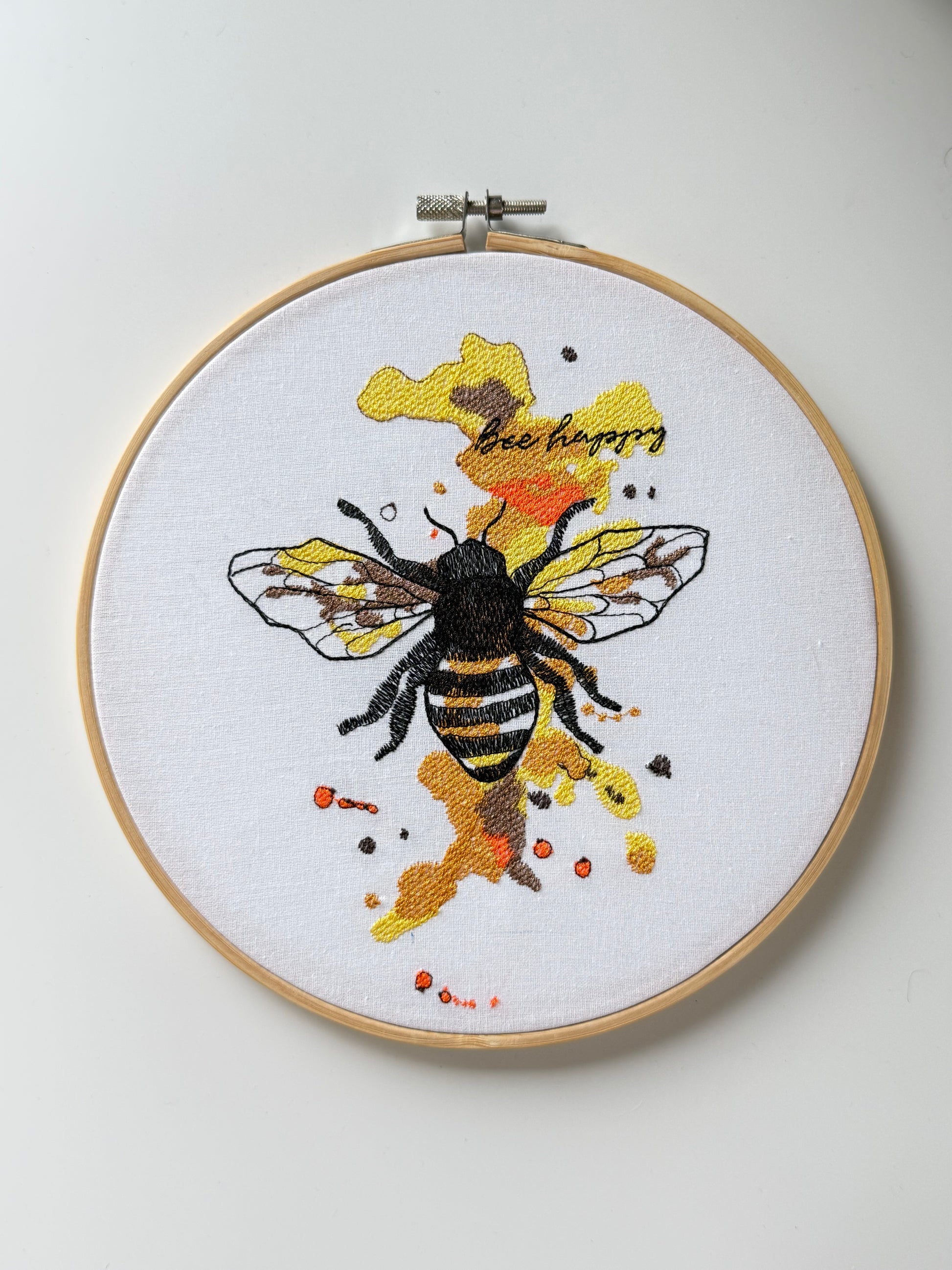 Dette unike broderiet kombinerer lekent uttrykk med tidløs sjarm. Motivet viser en forenklet bie plassert over en brodert vannmalingseffekt i varme gule og oransje toner. Under motivet står teksten bee happy, som gir et lyst og positivt budskap. Broderiet er laget på gjenbrukstekstil i 100 % bomull, og presentert i en vakker broderingsramme av treverk.