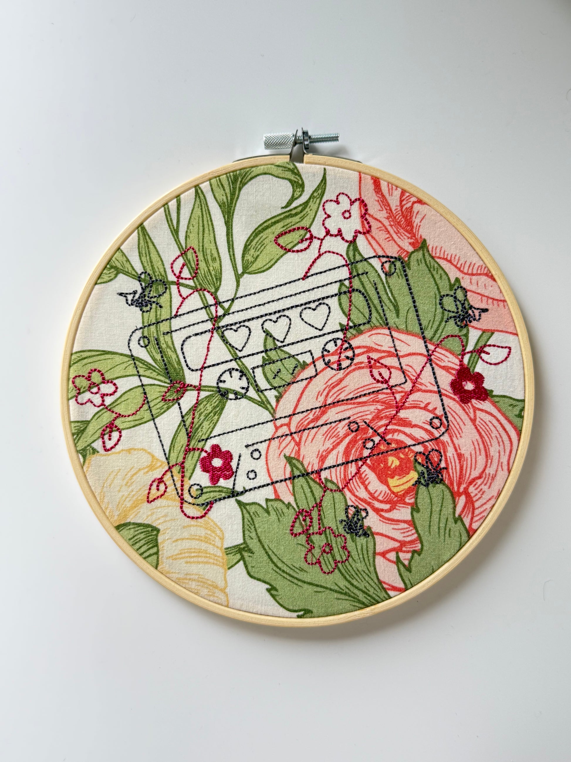 Dette unike broderiet kombinerer retro sjarm med tidløs eleganse. Motivet viser en klassisk kassett i rosa maskinbroderi, pyntet med blomster i rosa farge. Motivet er brodert på et vakkert blomstrete gjennbrukstekstil i 100% bomull. Designet er presentert i en vakker broderingsramme laget i treverk.