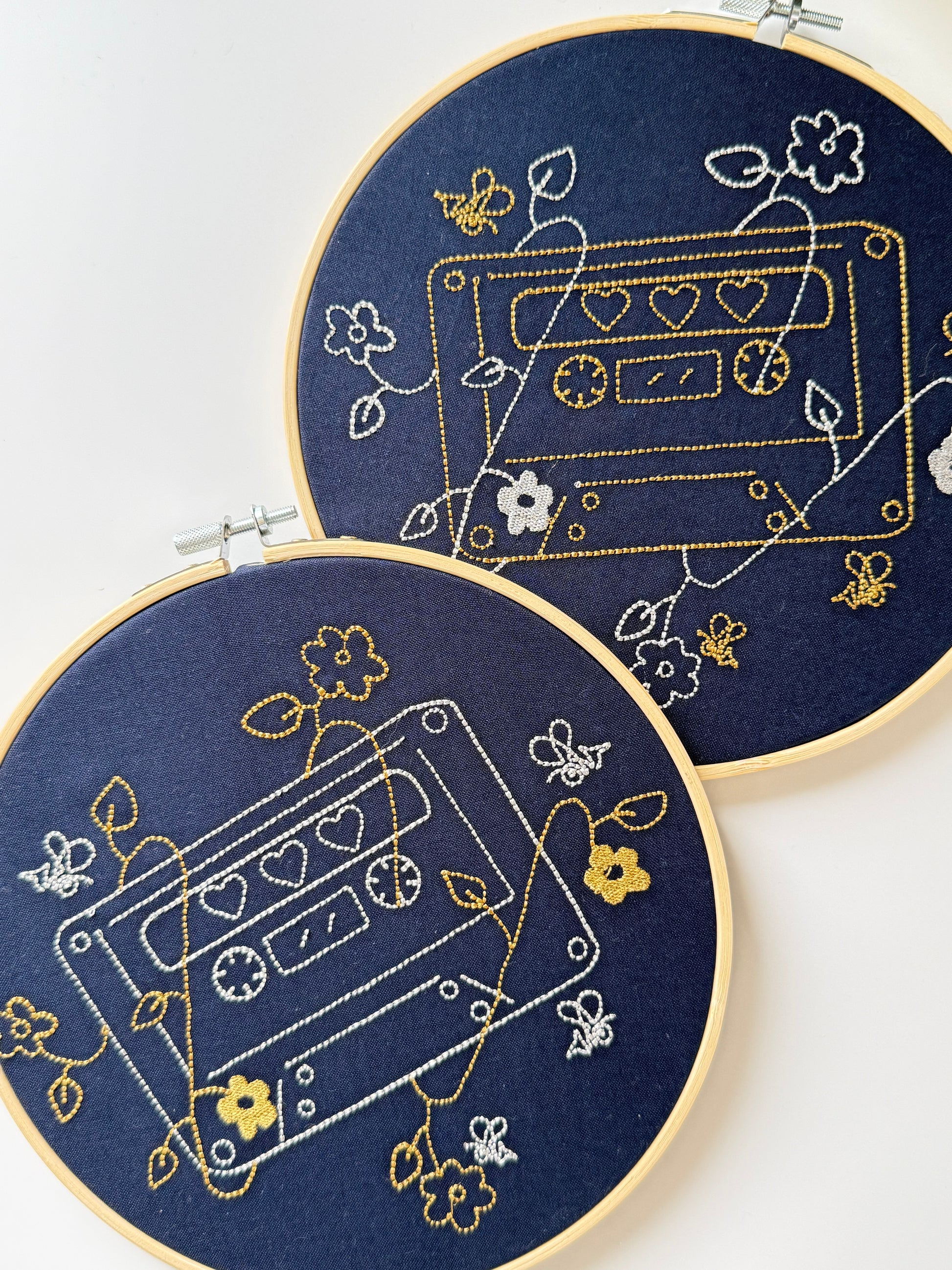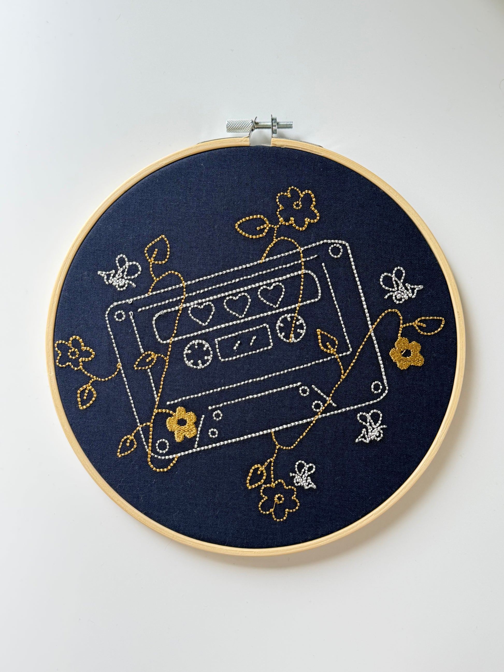 Dette unike broderiet kombinerer retro sjarm med tidløs eleganse. Motivet viser en klassisk kassett i sølvtone maskinbroderi, pyntet med blomster i gyllen farge som gir en moderne og stilfull kontrast. Designet er brodert på gjenbrukstekstil i 100% bomull, og presenteres i en vakker broderingsramme laget i treverk.