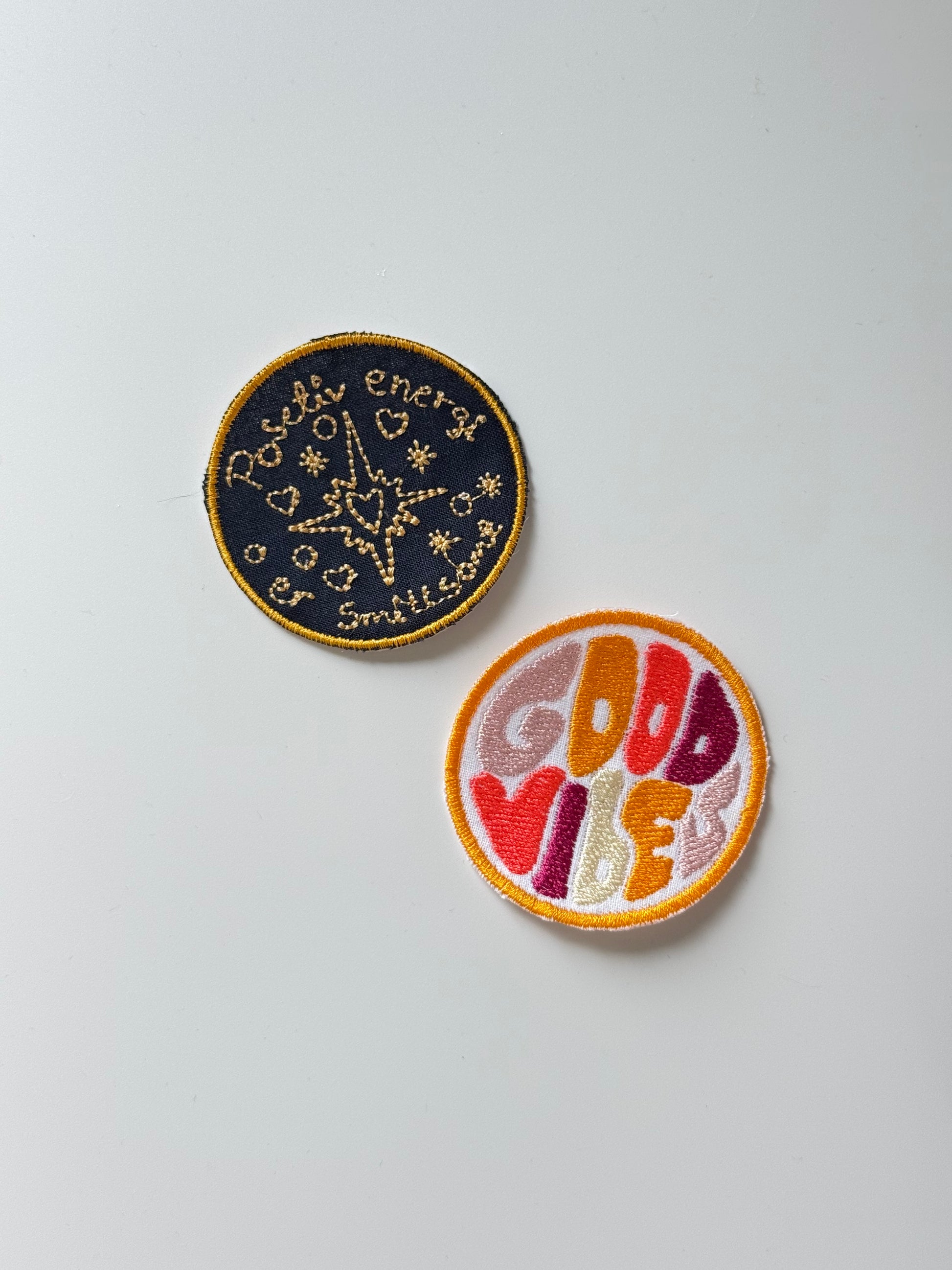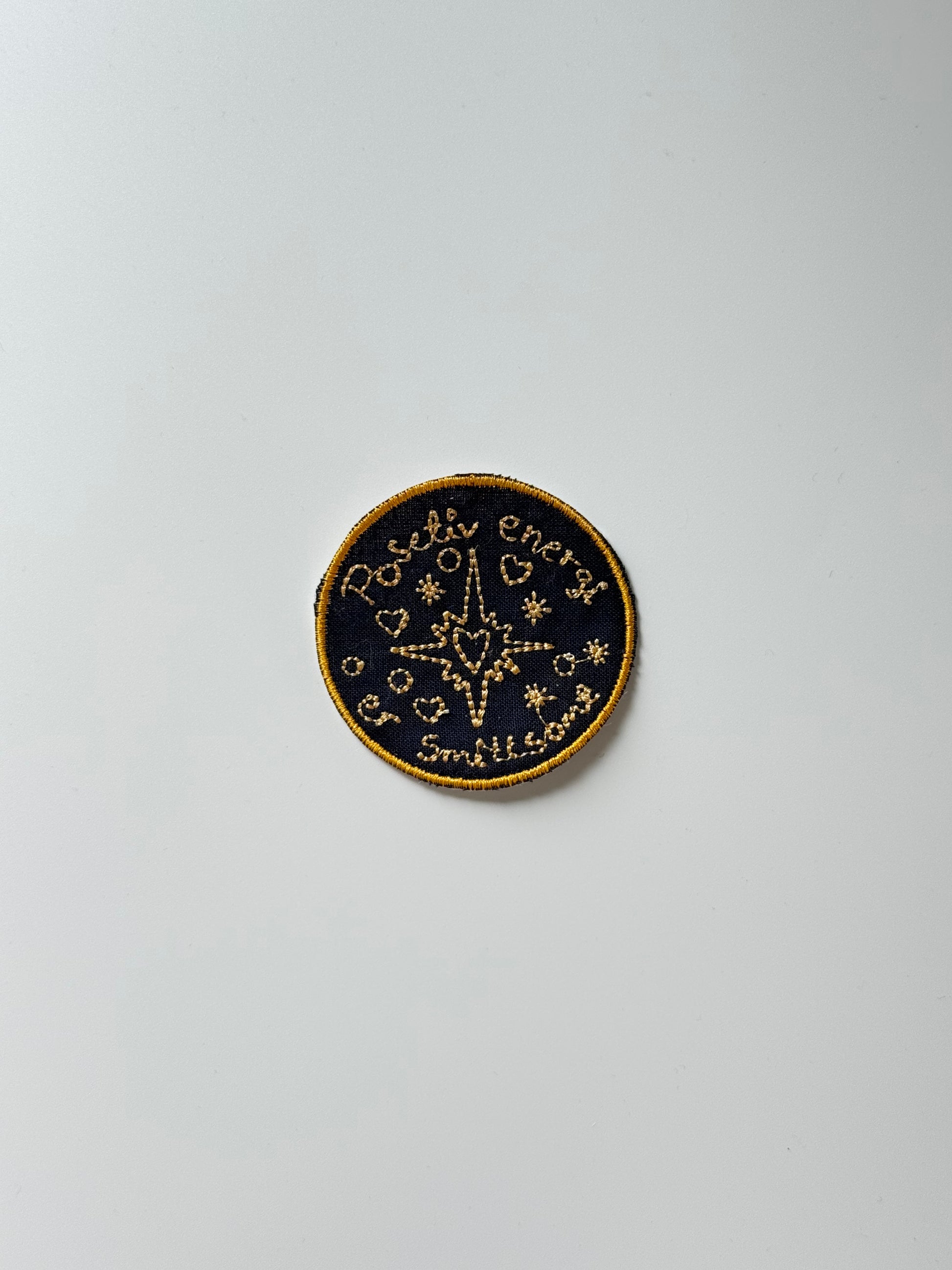 Gi klærne dine et løft med dette unike strykemerket, brodert på mørkeblått gjenbruksstoff i 100% bomull med gyllen tråd. Motivet viser en stjerne med et hjerte i midten, omgitt av små stjerner, sammen med teksten: «Positiv energi er smittsomt». Et dekorativt merke som både sprer et inspirerende budskap og kan brukes til å pynte opp klær eller dekke over små hull og flekker. Baksiden har et varmeaktiverende lim som gjør det enkelt å feste.