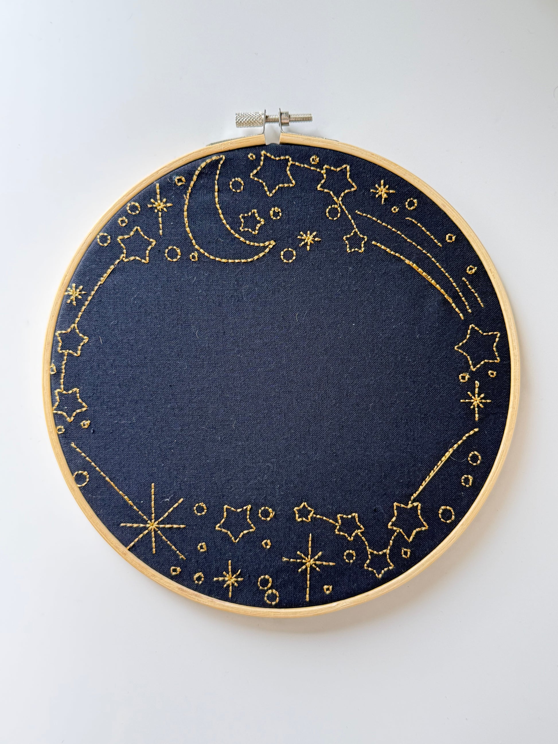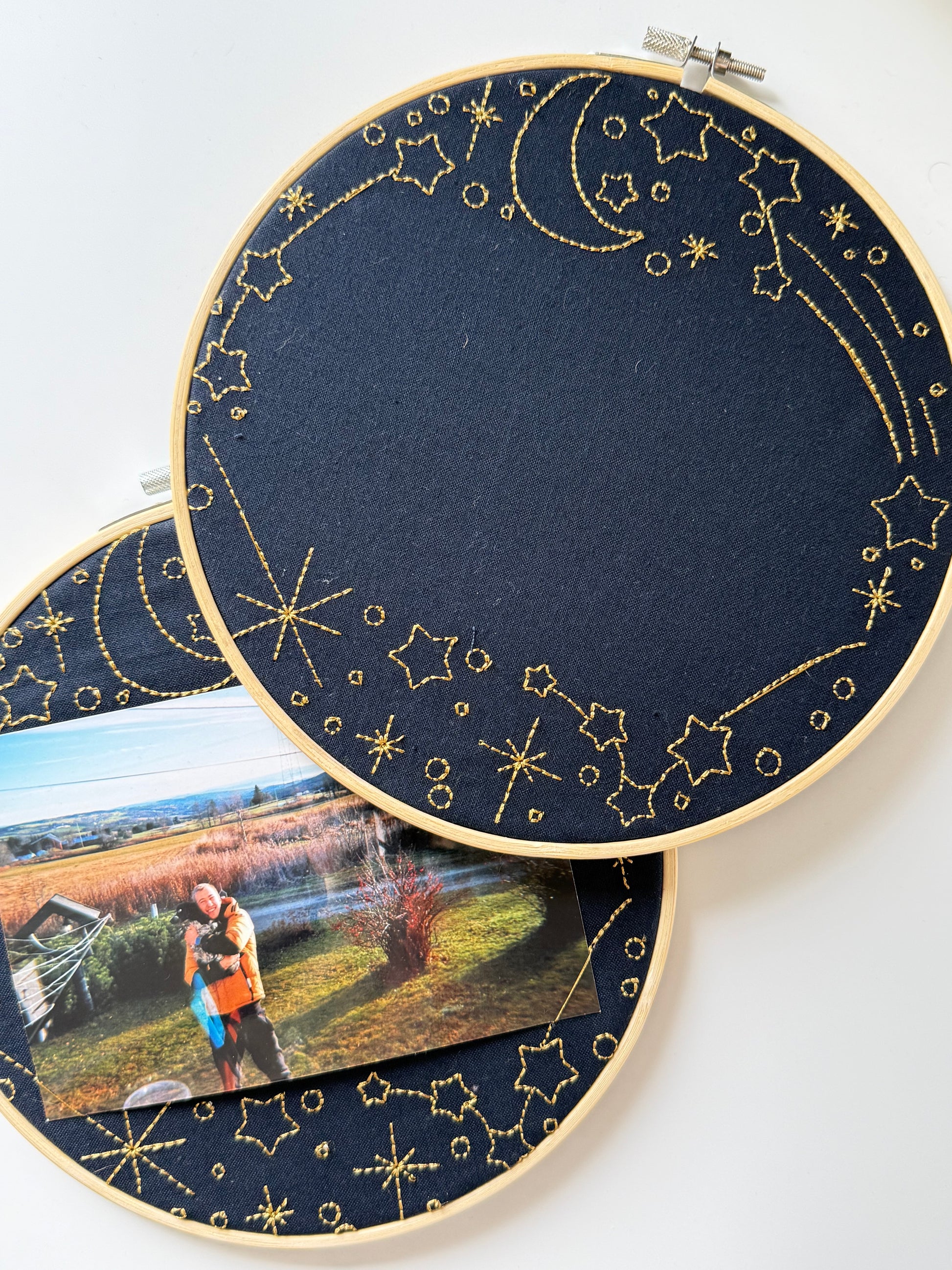 Dette unike broderiet kombinerer minner og magi i ett og samme uttrykk. Motivet viser en gyllen brodert stjernehimmel med måne og stjerner, brodert på mørkeblått gjenbruksstoff i 100 % bomull. I midten av motivet er det en åpning som fungerer som en bilderamme – perfekt for å sette inn et personlig bilde eller et minne du vil bevare på en helt spesiell måte. Den gyldne tråden mot den dype blå bakgrunnen gir et drømmende og tidløst preg, og broderiet er presentert i en vakker ramme av treverk.