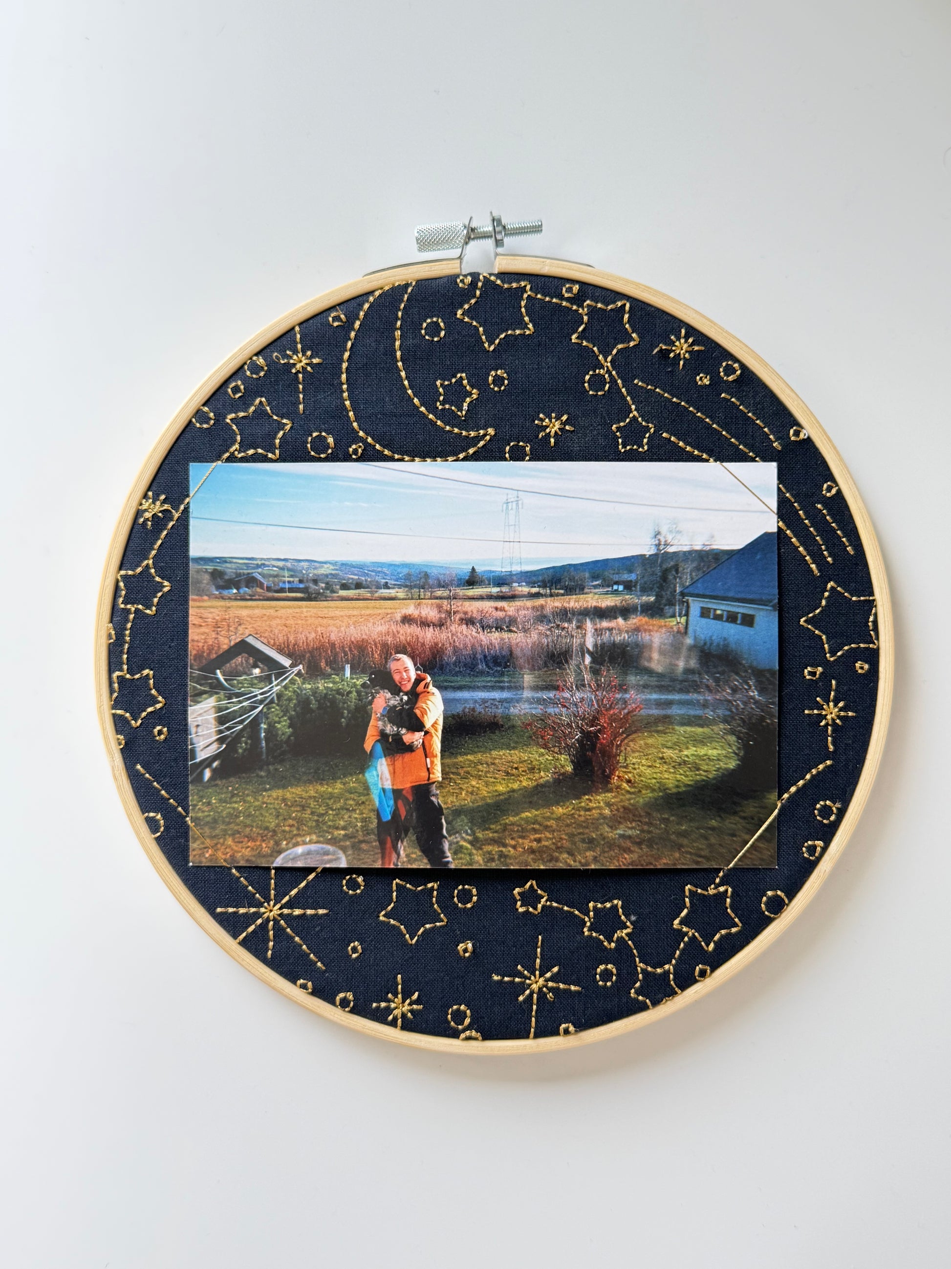 La stjernehimmelen omfavne et kjært bilde eller minne, og skape et personlig blikkfang i hjemmet. Heng broderiet i stua for å gi rommet en poetisk stemning, plasser det på soverommet for å bevare et nært minne, eller bruk det som en unik gave til noen du er glad i. Motivet passer perfekt for deg som verdsetter håndverk med sjel og design som gir plass til det som betyr mest.