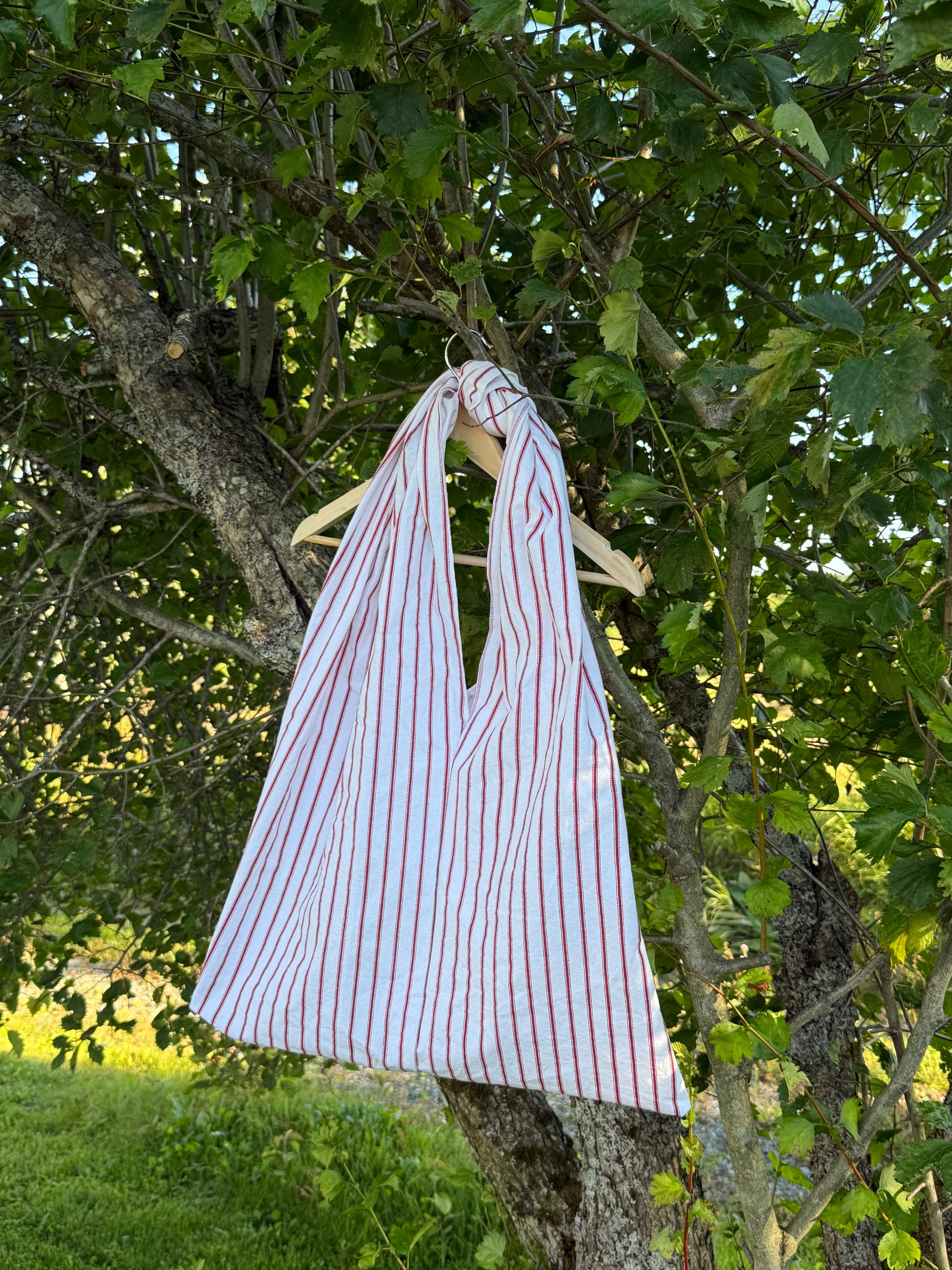 Bagen er håndlaget av meg i gjenbruksmaterialer av 100% bomull, sydd i et zero-waste design som gir null avfall i produksjonen. Dette gjør hver totebag til et bærekraftig valg for deg som ønsker å kombinere praktisk bruk med miljøbevissthet.