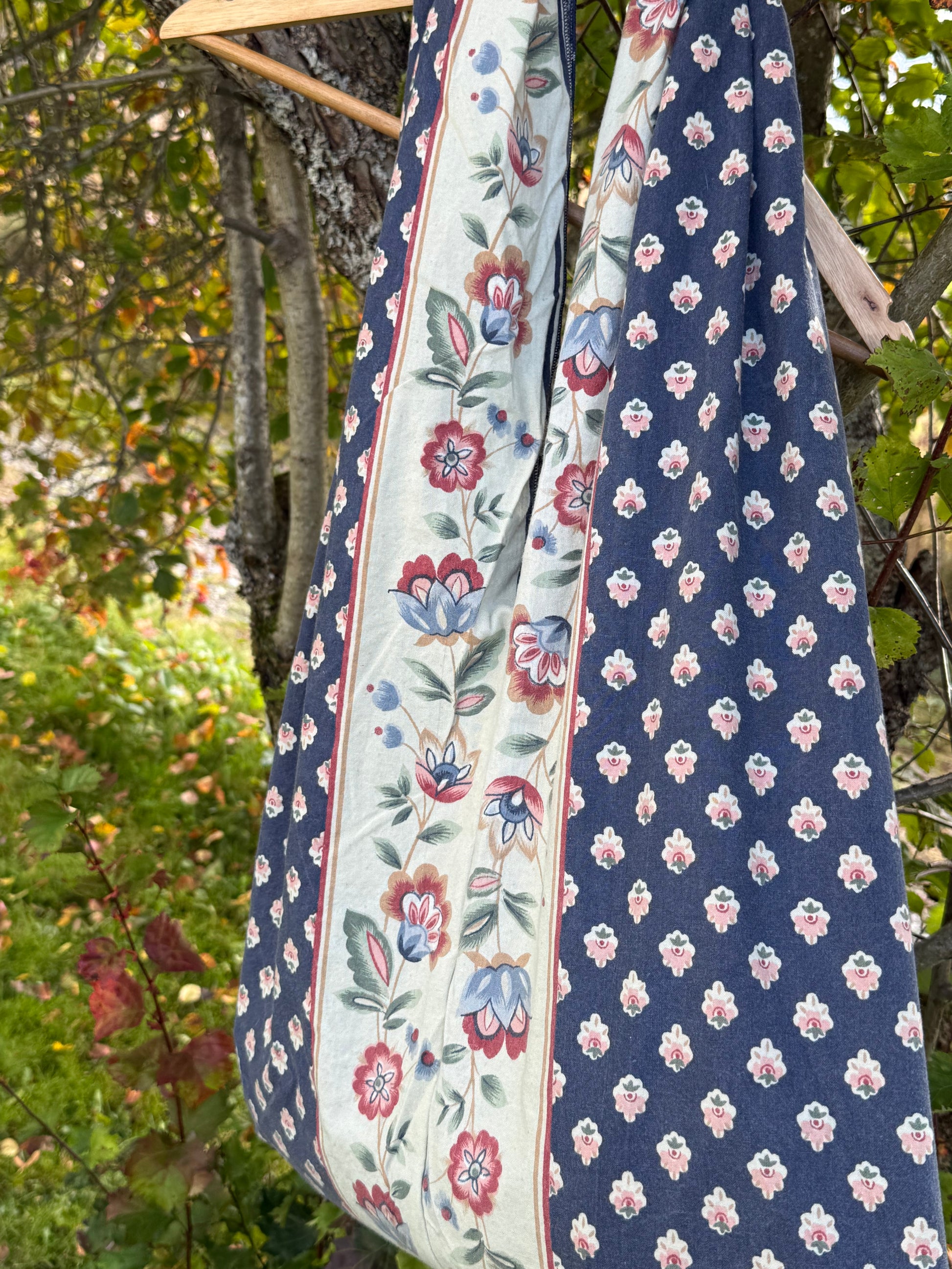 Merk: Siden hver bag er håndlaget av forskjellige gjenbruksstoff, kan stoff, farger og mønster variere noe fra bilde til bilde. Dette gjør hver totebag helt unik!