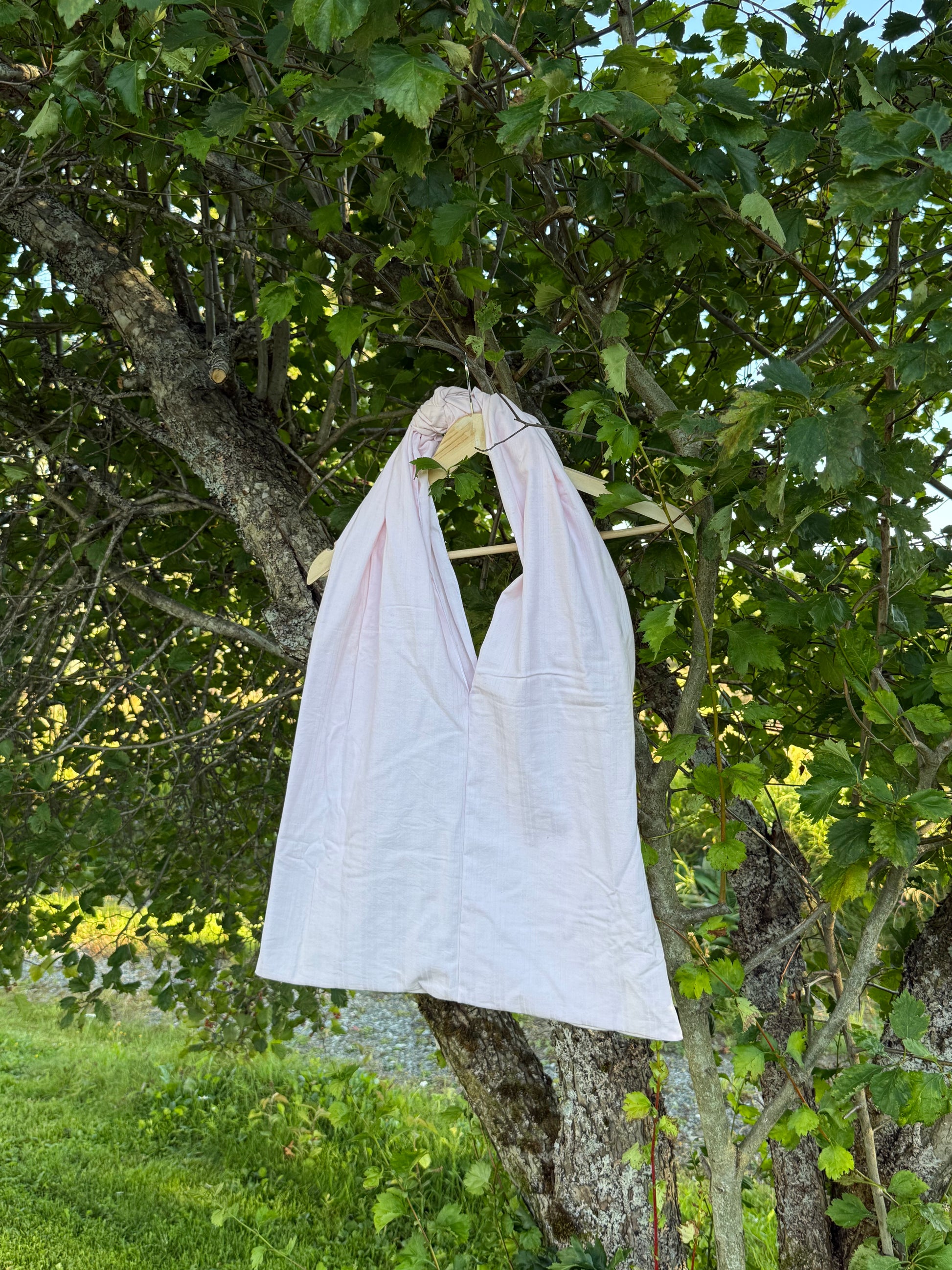 Bagen er håndlaget av meg i gjenbruksmaterialer av 100% bomull, sydd i et zero-waste design som gir null avfall i produksjonen. Dette gjør hver totebag til et bærekraftig valg for deg som ønsker å kombinere praktisk bruk med miljøbevissthet.