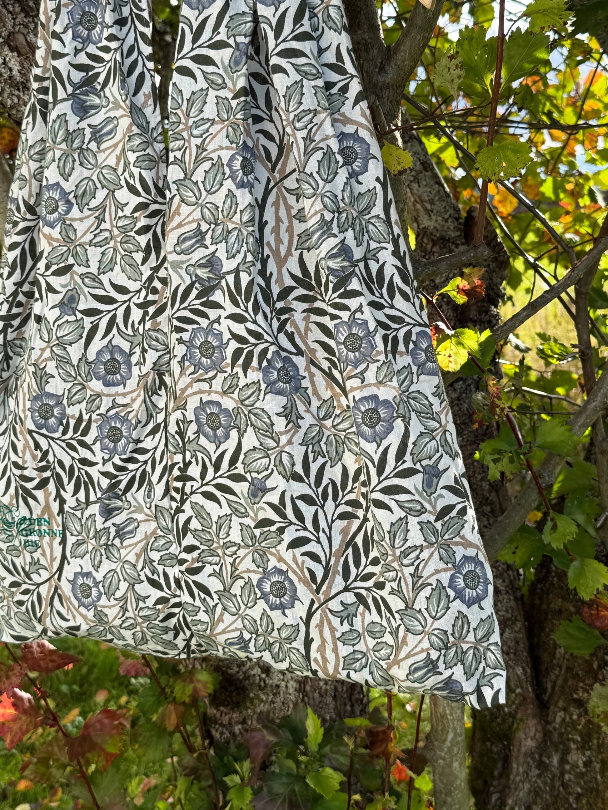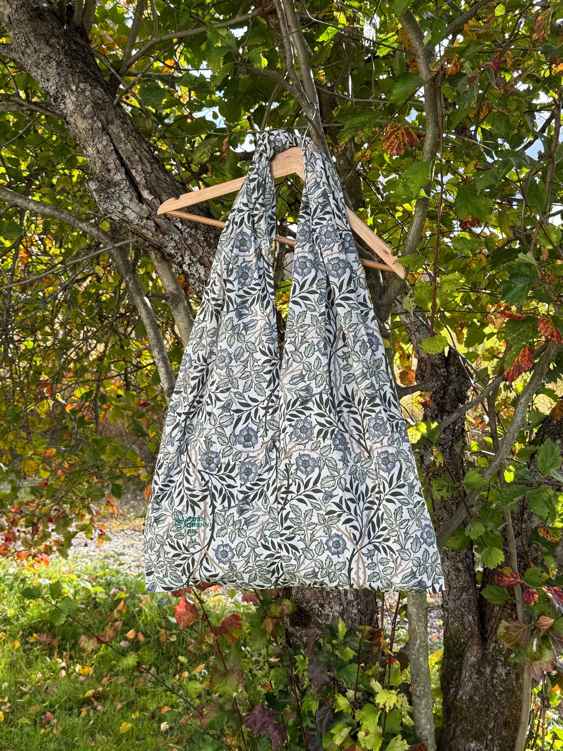 Bagen er håndlaget av meg i gjenbruksmaterialer av 100% bomull, sydd i et zero-waste design som gir null avfall i produksjonen. Dette gjør hver totebag til et bærekraftig valg for deg som ønsker å kombinere praktisk bruk med miljøbevissthet.